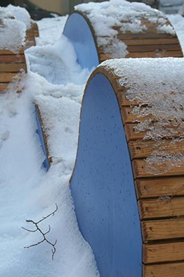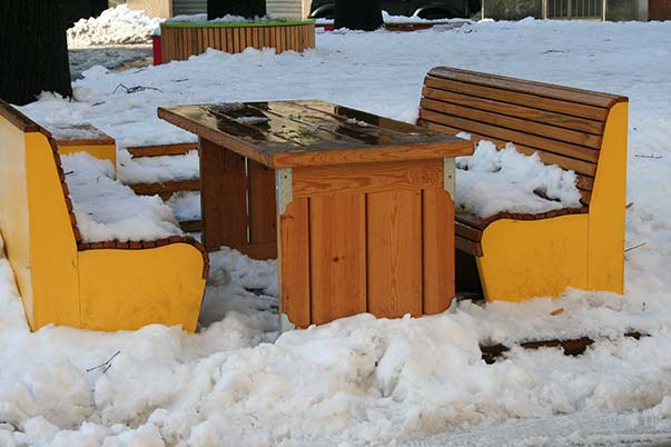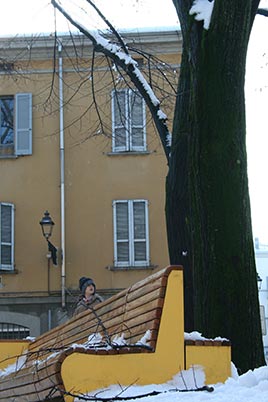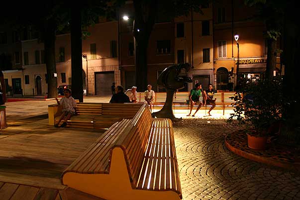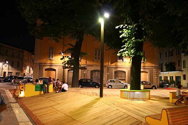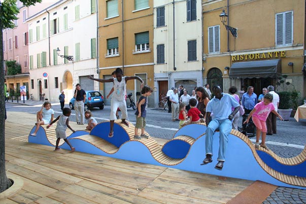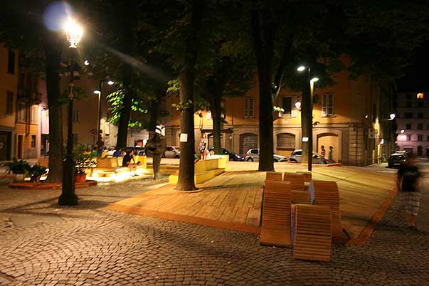 Riqualificazione della piazza con allestimento temporaneo in legno per il gioco e il tempo libero.